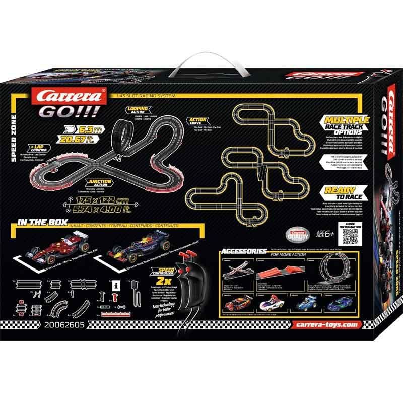 Carrera GO F1 Ferrari and Red Bull Circuit With the Carrera GO!!! "Speed Zone" set, two of motorsport's greatest icons go head-to-head: Max Verstappen in the Oracle Red Bull Racing RB21 "M. Verstappen," and Lewis Hamilton in the Ferrari SF25 "L. Hamilton." On a spectacular 6.3-meter circuit, the drivers push their limits with high-speed straights, tight corners, and a loop, delivering exhilarating action. With meticulously recreated cars and dynamic track elements, the thrilling atmosphere of Formula 1 comes right to your home. Now there's only one thing left to do: put the pedal to the metal and prove who's the fastest on the track! Discover the perfect setting for an epic rivalry that you control yourself! Includes: 1 Ferrari SF-25 No. 44 Formula 1 car driven by Lewis Hamilton, 1 Oracle Red Bull Racing RB21 No. 1 Formula 1 car driven by Michael Verstappen, 1 Speed Zone race track with loop, fly-over, lap counter, crossover, barriers, two turbo controllers, and other cool details. Approximate dimensions of the completed track: 175 cm long and 122 cm wide. Approximate track length: 6.3 meters. Approximate dimensions of each car: 2 cm high, 4.5 cm wide, and 11 cm long. Adult assembly required. Material: Plastic Manufacturer's recommended age: 6+ years WARNING: Not suitable for children under 3 years old, as it contains small parts which could cause choking if swallowed. Keep out of reach of children under 3 years. Use under direct adult supervision. Remove packaging and fasteners before giving the toy to a child. Complies with European safety standards.