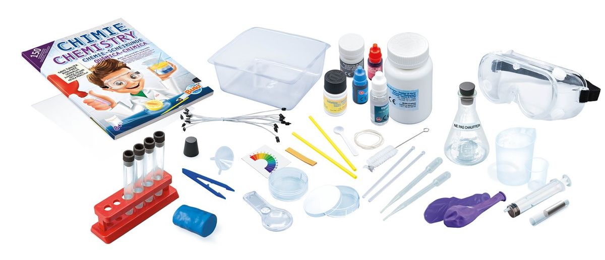 Buki Chemistry 150 Experiments 150 safe chemistry experiments! Why does oil float on water? How does baking soda react with vinegar? How do you make bubble solution? Safe: You only need ingredients you can find at home: salt, vinegar, flour, and oil. None of the 150 experiments require the use of chemicals. Includes the tools to carry out 150 experiments: beakers, tweezers, and measuring spoons; pipettes and stirring rods; flask and goggles; plaster of Paris, glycerin, baking soda, and gelatin; magnifying glass and magnet, etc. Manufacturer's recommended age: 8+ years WARNING: Not suitable for children under 3 years old, as it contains small parts that could cause choking if swallowed. Keep out of reach of children under 3 years old. Use under the direct supervision of an adult. Remove packaging and fasteners before giving the toy to the child. Complies with European safety standards.