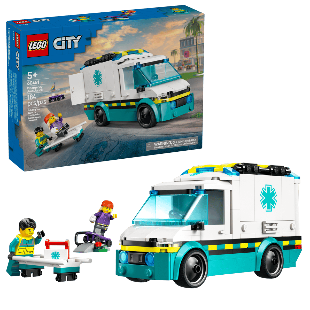 Exciting rescue missions await with the LEGO City Emergency Ambulance toy for ages 5 and up! Kids lift the side panels and open the rear doors for easy access to the interior, which includes a stretcher, toy syringe, bandage, medical bag, and more. The set also comes with a skateboard and skate ramp, as well as minifigures of a skateboarder and a paramedic for hours of imaginative storytelling. This set includes a printed step-by-step building guide and 3D instructions in the LEGO Builder app, allowing children to explore and save builds, track their progress, and view models from all angles as they build. LEGO City Great Vehicles sets offer detailed land, air, and sea toys that encourage imaginative play. Your child can add this toy emergency vehicle to other LEGO City sets (sold separately) to expand their adventures.