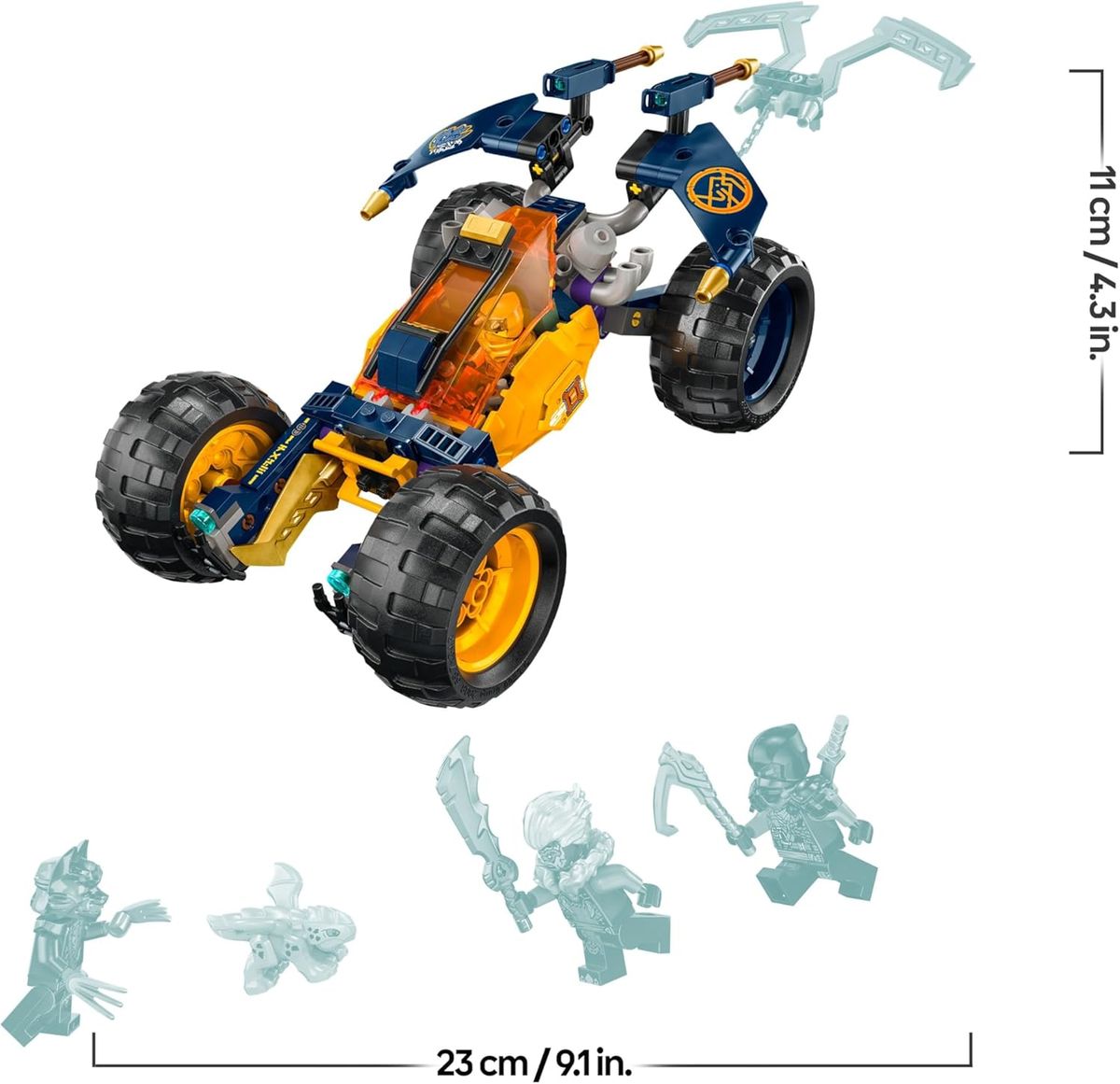 Kids aged 7 and up can recreate the exciting battles from season 2 of the Ninjago: Rise of the Dragons TV series with Arin's Ninja Off-Road Buggy from LEGO Ninjago. This adventure set includes a yellow toy vehicle—Arin's signature color—equipped with rolling wheels, suspension, an opening cockpit with room for 2 minifigures, 2 stud shooters with 6 projectiles, and a large grappling hook on the back for catching villains. The ninja toy comes with a Baby Riyu figure and 4 Ninjago minifigures: Cole the Climber (with grappling hook and katana), Arin (with grappling hook and katana), Wolf Mask, and Cinder (with a sword). LEGO Ninjago ninja toys include mechs, dragons, and temples for fans to role-play with their heroes (sold separately). You and your child can build each set with the help of the LEGO Builder app, your guide to the building adventure.